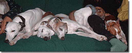 | Am 1. Mai trafen sich 23 Whippets, ein Greyhound, ein Hovawart, ein Podengo Portugues Pequeno, eine Luka und ihre Menschen zum Mai-Spaziergang in Gummersbach. Nachdem es am Vortag wie aus Eimern geschüttet hatte, benahm das Wetter während des Treffens eingiermassen, so dass die Hunde ausgiebig Gelegenheit zum Toben hatten. Anschliessend gab´s Speis´und Trank für Zwei- und Vierbeiner, was alle ziemlich müde und satt zurückließ ;-) | ![]() |