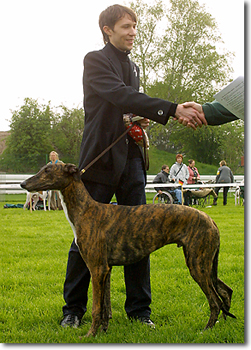 vertreten war. Das Jugend-BOB und den Titel eines Jahresjugendsiegers konnte sich Karkati´s Pablo Picasso sichern. Sein Züchter und Besitzer, Roberto Posa hat die Heimreise in die Schweiz also reichlich mit Ehrengaben versehen angetreten. Der Titel der Jahresjugendsiegerin ist in heimischen Gefilden verblieben. Die Wahl fiel auf Arabella von der Oelmühle (Züchter: Jürgen Papenfuß und Jürgen Rösner, Eigentümer: Familie Schneider). Einer der eigentlichen Gewinner der Jahressieger-Zuchtschau in Oberhausen war gar nicht anwesend. Sobald Espen Engh von Jet´s Greyhounds im weit entfernten Norwegen die Ergebnisliste durchsieht, wird auch seine Laune alles andere als schlecht sein, denn bei allen vier Siegerhunden taucht spätestens in der Großelterngeneration der Name "Jet´s" auf. Zu guter Letzt entwickelte sich der 16. April dann noch zum "Knaubertag", denn die Saarbrücker durften sich auch über das BIS und die Preise für das beste Paar sowie die beste Zuchtgruppe freuen. Die wichtigsten Ergebnisse entnehmen Sie bitte den Bildunterschriften. |