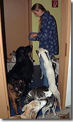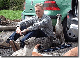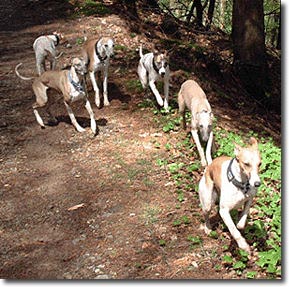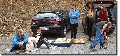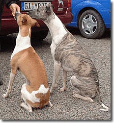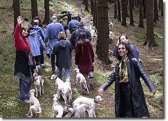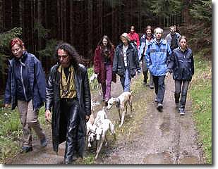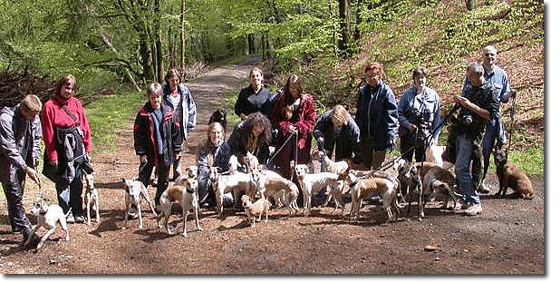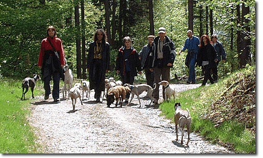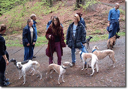 Am 1. Mai trafen sich 23 Whippets, ein Greyhound, ein Hovawart, ein Podengo Portugues Pequeno, eine Luka und ihre Menschen zum Mai-Spaziergang in Gummersbach. Nachdem es am Vortag wie aus Eimern geschüttet hatte, benahm das Wetter während des Treffens eingiermassen, so dass die Hunde ausgiebig Gelegenheit zum Toben hatten. Anschliessend gab´s Speis´und Trank für Zwei- und Vierbeiner, was alle ziemlich müde und satt zurückließ ;-) | ![]() |