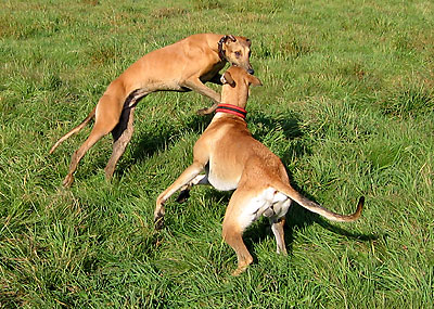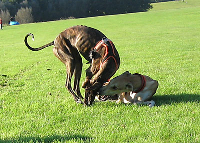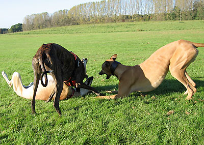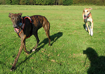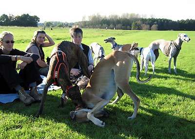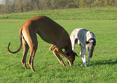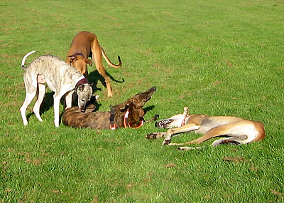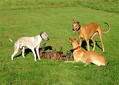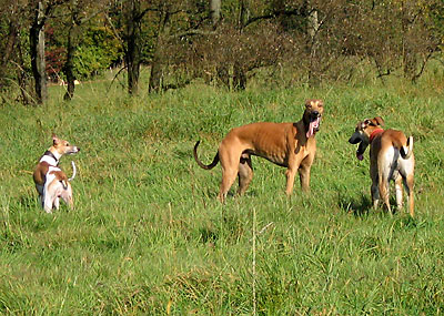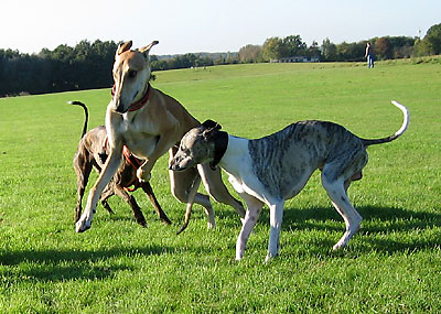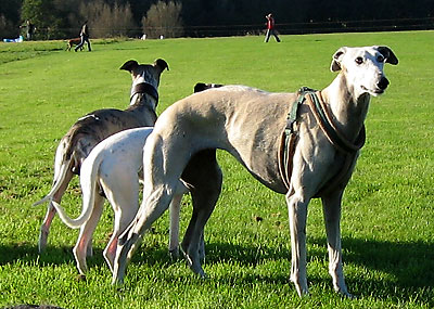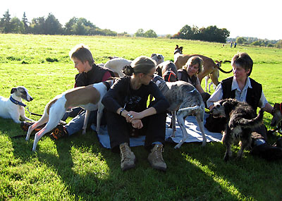 Da ich am 16.10.2005 anlässlich der Bundessiegerzuchtschau Dortmund ohnehin im Ruhrgbiet war, nutzte ich die Gelegenheit, mich anschliessend am Auberg mit einigen anderen Windhundbesitzern zu einem Spaziergang zu treffen. Ich wollte doch endlich mal einen Chortaj (oder richtiger: Chortaja Borzaja) zu treffen: Chubais, ein Rüde im selben Alter wie mein Greyhound Rufus. Dabei waren die Whippet-Rüden Mojo, Lennox, Loriot, Candy & Moony, die Galgo-Damen Biene & Juma, der Chortaj Chubais sowie Dackelmix-Hündin Jette.